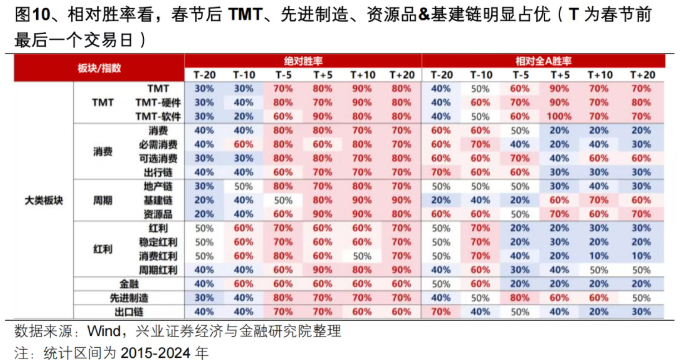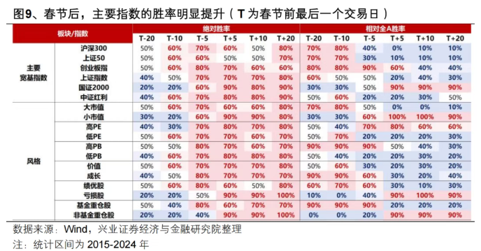 而从日历效应角度看,兴业证券首席策略分析师张启尧指出,节后随着风险偏好提升、增量资金释放,主要指数胜率迎来明显提升,风格上也以小盘、成长、主题为代表的高弹性板块明显占优,届时市场向上空间有望再一次打开。