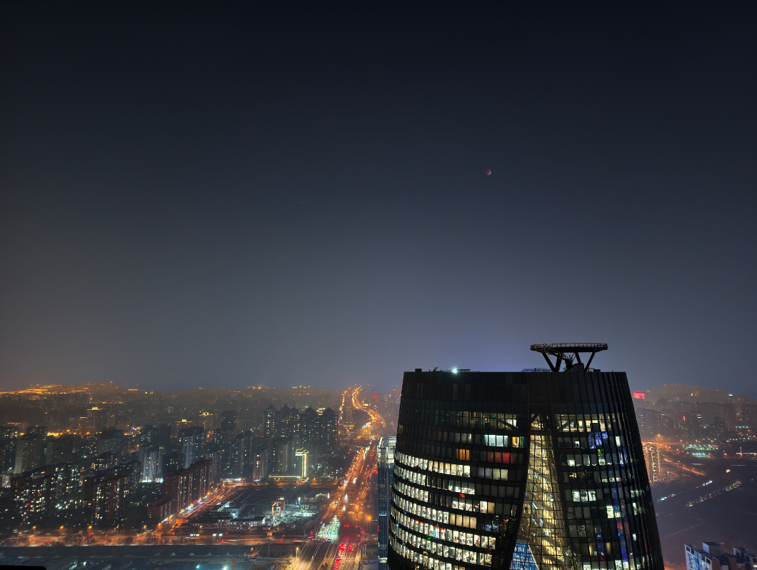天文摄影大V戴建峰将直播装备搭在了北京司马台长城附近。18:45分许,神奇时刻降临:明暗交界线中,透着幽幽红光、“被咬掉”一口的月亮,仿佛一位穿越时空的故人,从长城左下角的山边缓缓爬升,掠过的山脊,挂在漆黑夜空,静待食既、食甚、生光等阶段的来临。那一刻,“当年明月照今人”的诗意具象化,历史的厚重与宇宙的浩瀚在镜头中完美交融。