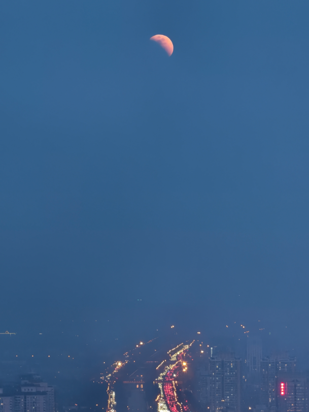 在北京丰台,摄影师王俊峰迎来了天时地利的馈赠。“美哭了!”他兴奋地告诉封面新闻。万家灯火中,他捕捉到了挂在蓝色天幕中的“缺月”。
