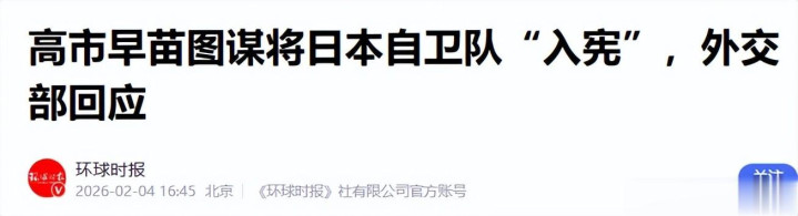环球时报——2026年2月4日——高市早苗图谋将日本自卫队“入宪”,外交部回应