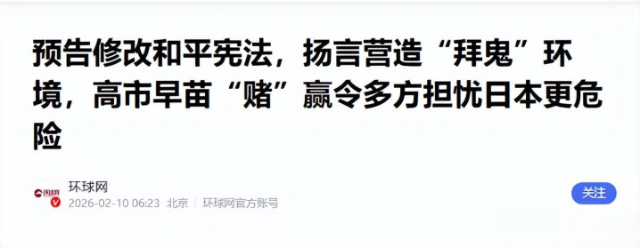 环球网——2026年2月10日——预告修改和平宪法,扬言营造“拜鬼”环境,高市早苗“赌”赢令多方担忧日本更危险