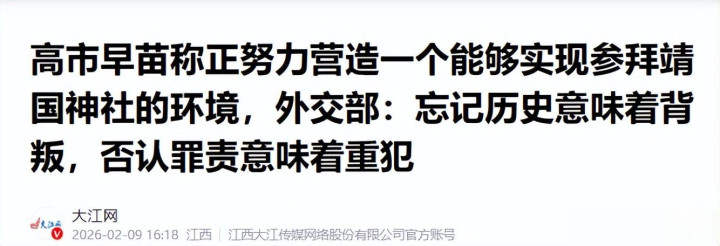 大江网——2026年2月9日——高市早苗称正努力营造一个能够实现参拜靖国神社的环境,外交部:忘记历史意味着背叛,否认罪责意味着重犯